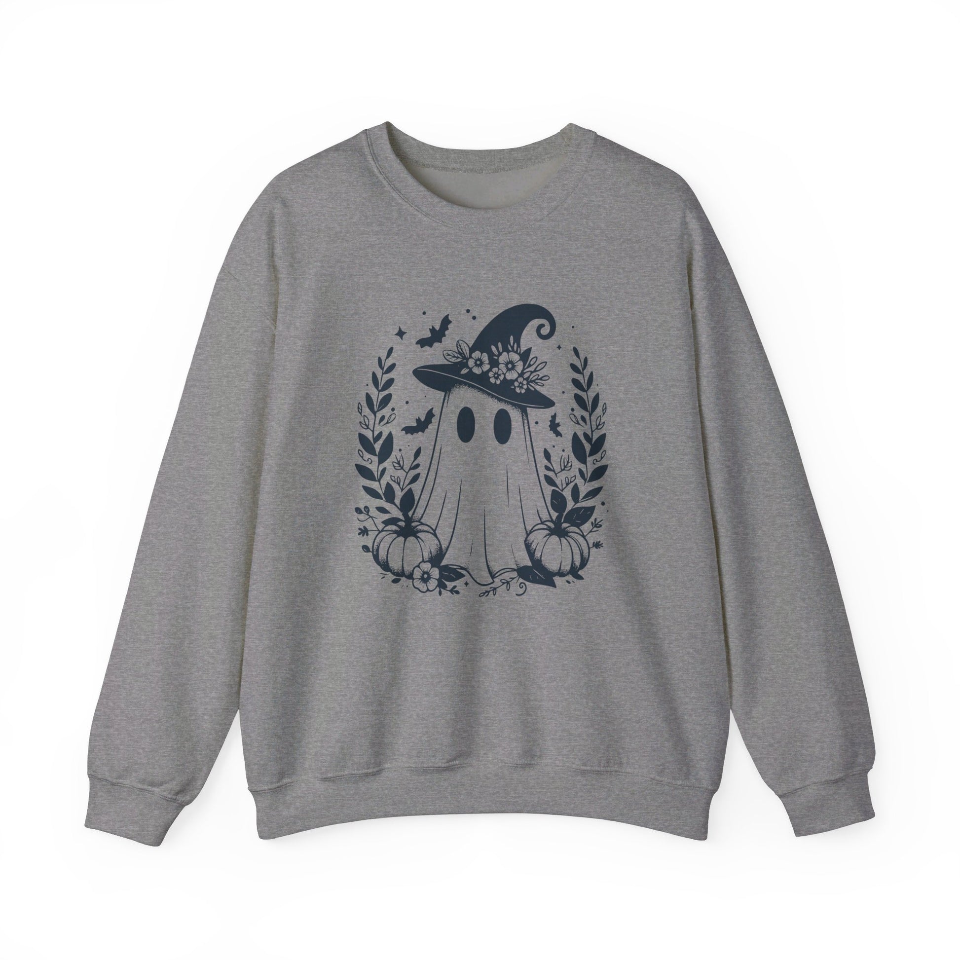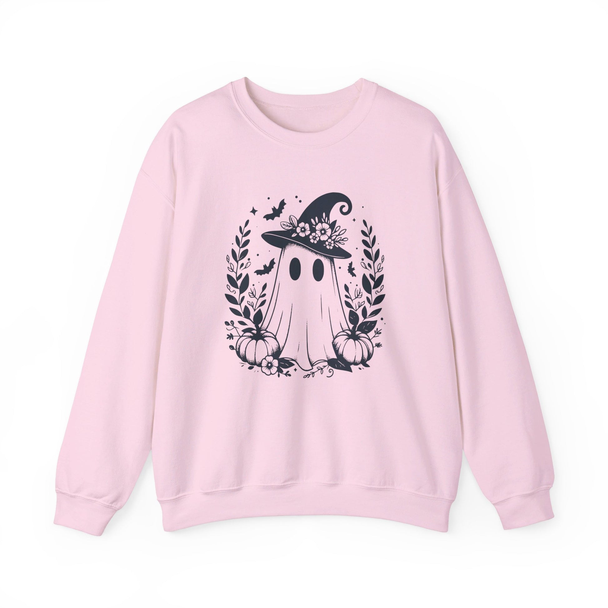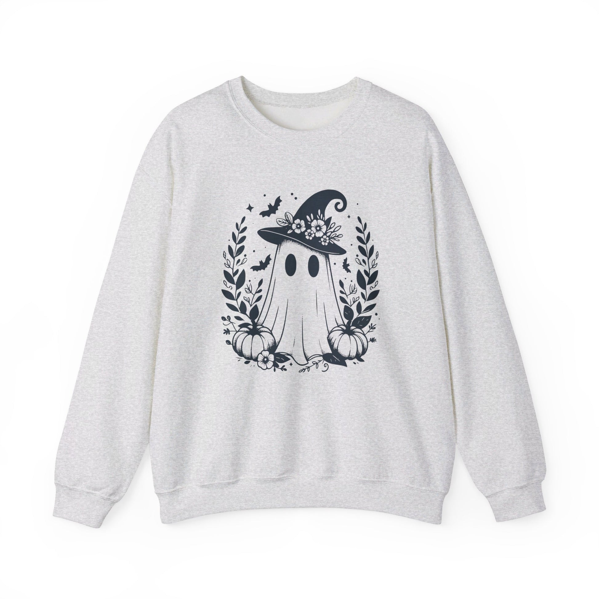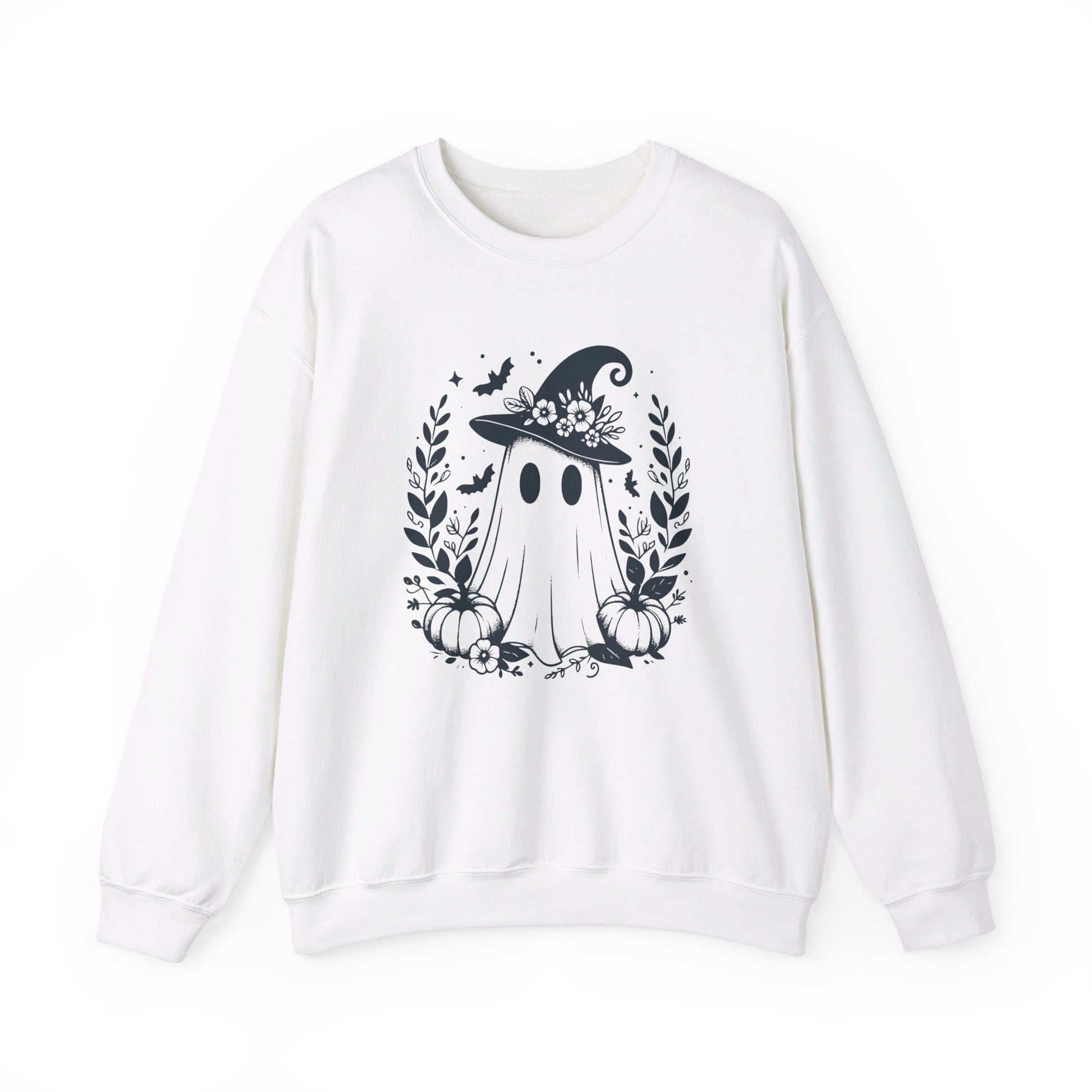 The "Spooky Boo in the Garden" sweatshirt exudes a cozy, playful vibe perfect for the Halloween season. It features a whimsical illustration of a cute ghost (nicknamed "Boo") floating among a garden of pumpkins, eerie vines, and maybe a few friendly bats fluttering around. The garden is slightly overgrown, giving it a haunted yet charming aesthetic. The sweatshirt itself is soft, made from a comfortable blend of cotton and polyester, with a relaxed fit and ribbed cuffs.